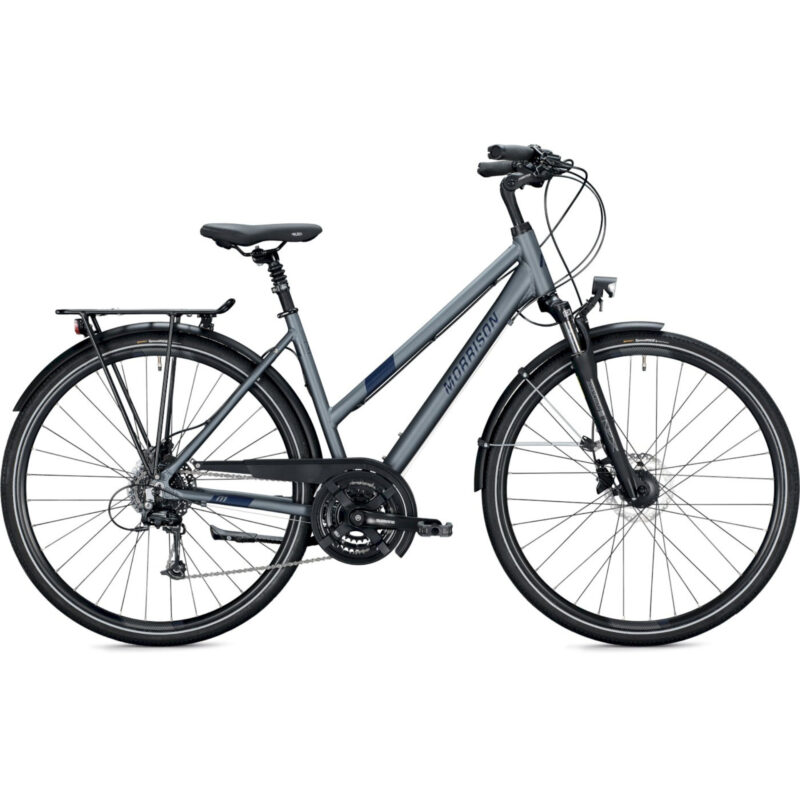 Morrison T-serien fås i en elegant mørkeblå farve og er fuldt udstyret med støtteben, bagagebærer og holdbare komponenter, der sikrer mange års fornøjelse.
